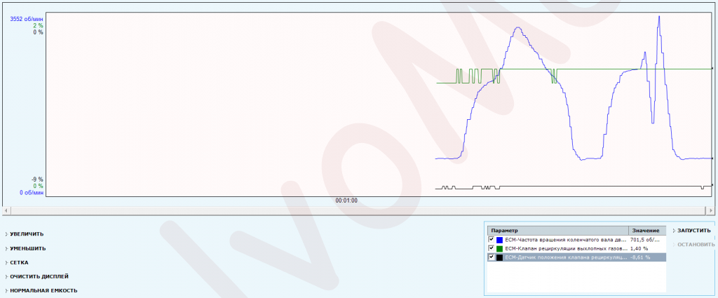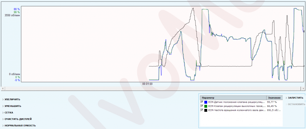 В автомобиле была тюнингованная прошивка Rica Stage 2 на 275 л.с., штатная работа клапана рецеркуляции выхлопных газов (EGR) на графике выглядит следующим образом: