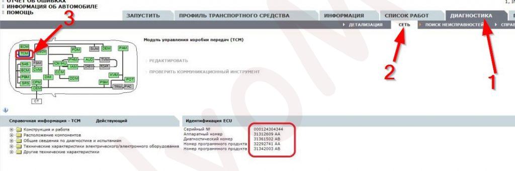 Переходим на вкладку Диагностика, Сеть, далее выбираем блок TCM и смотрим на аппаратный номер блока: