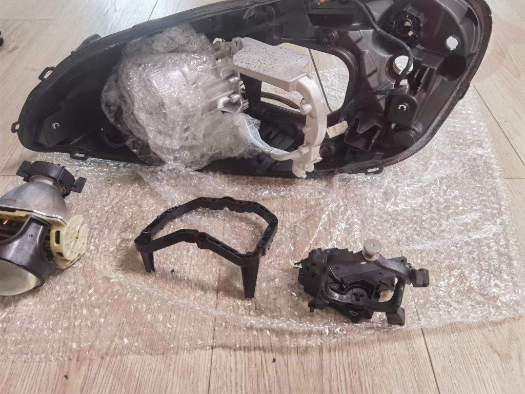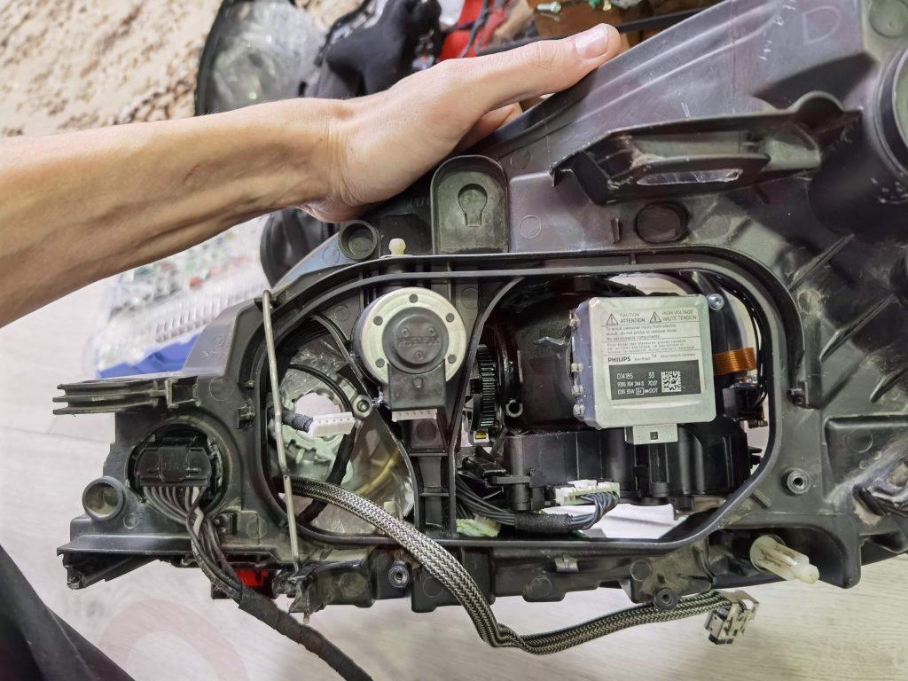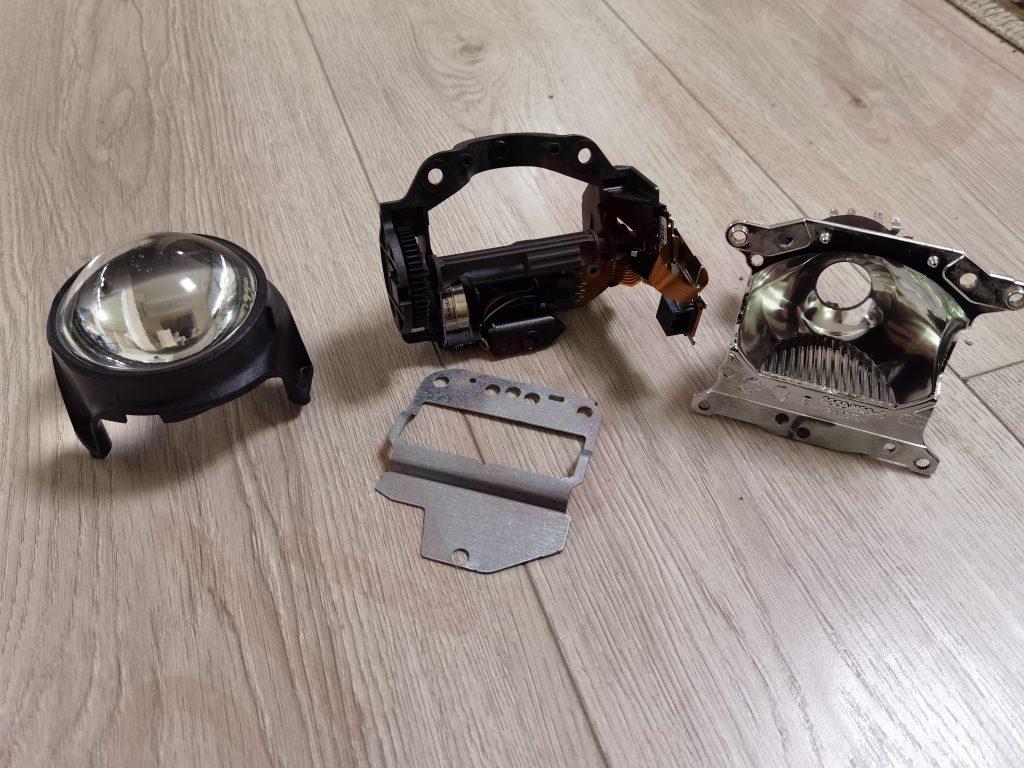 Фару разобрал, чтобы можно было удобно демонтировать старую линзу и проводку с поворотным механизмом.